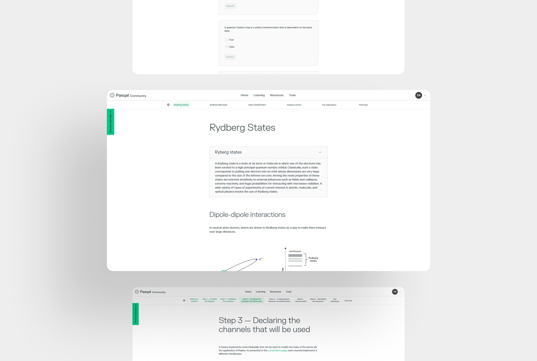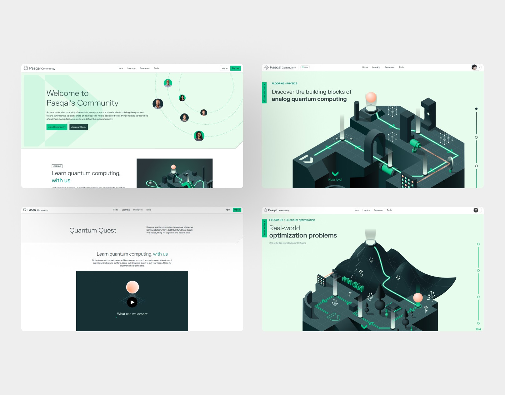 I started with targeted research by benchmarking platforms and interviewing researchers and engineers, this revealed the need for more immersive quantum education. Following this was the design of interactive learning courses "Quantum Quest". We rapidly tested, iterated on it with standardized lesson templates and refreshed visuals and implemented by extending Pasqal’s design system and supervising custom illustrations for a cohesive final community platform.